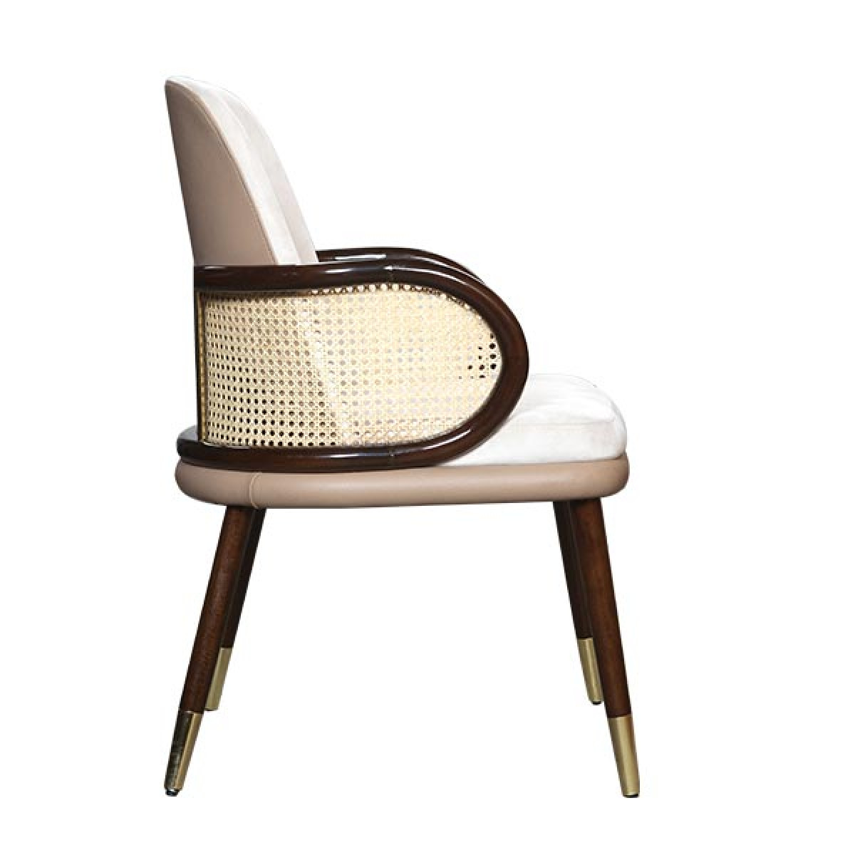 AKS 410 B Drvena Fotelja kombinuje masivnu drvenu konstrukciju sa bočnim panelima od trske i presvlakom u svetlim tonovima, pružajući elegantan i sofisticiran izgled. Ergonomski oblik naslona i mekano sedište obezbeđuju visok nivo udobnosti, čak i pri dužem korišćenju. Idealan je izbor za kafiće, restorane, hotele i moderne enterijere.