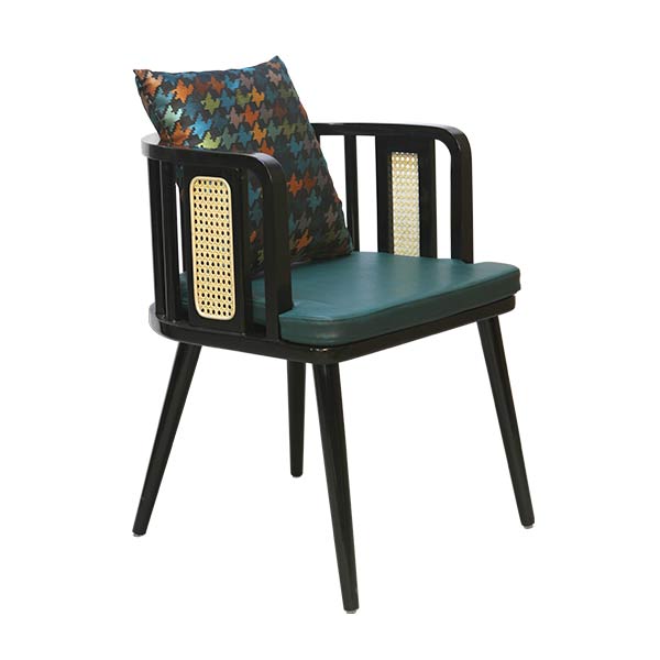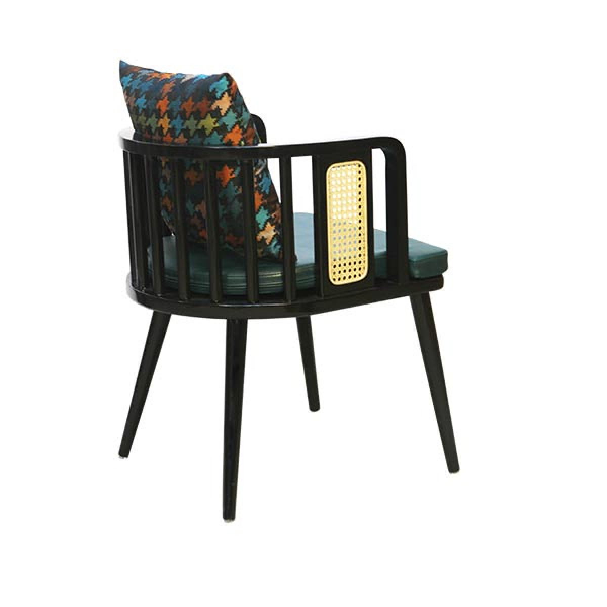 AKS 487 Drvena Fotelja Zelena & Višebojna kombinuje klasične detalje sa modernim dizajnom, stvarajući upečatljiv i topao izgled. Zeleno sedište u kombinaciji sa višebojnim, dezeniranim jastukom za leđa daje fotelji dinamičan karakter. Čvrsta drvena konstrukcija i dekorativni detalji od trske obezbeđuju dugotrajnost i estetsku vrednost. Idealna je za kafiće, restorane, butik hotele i savremene enterijere koji traže posebnost.