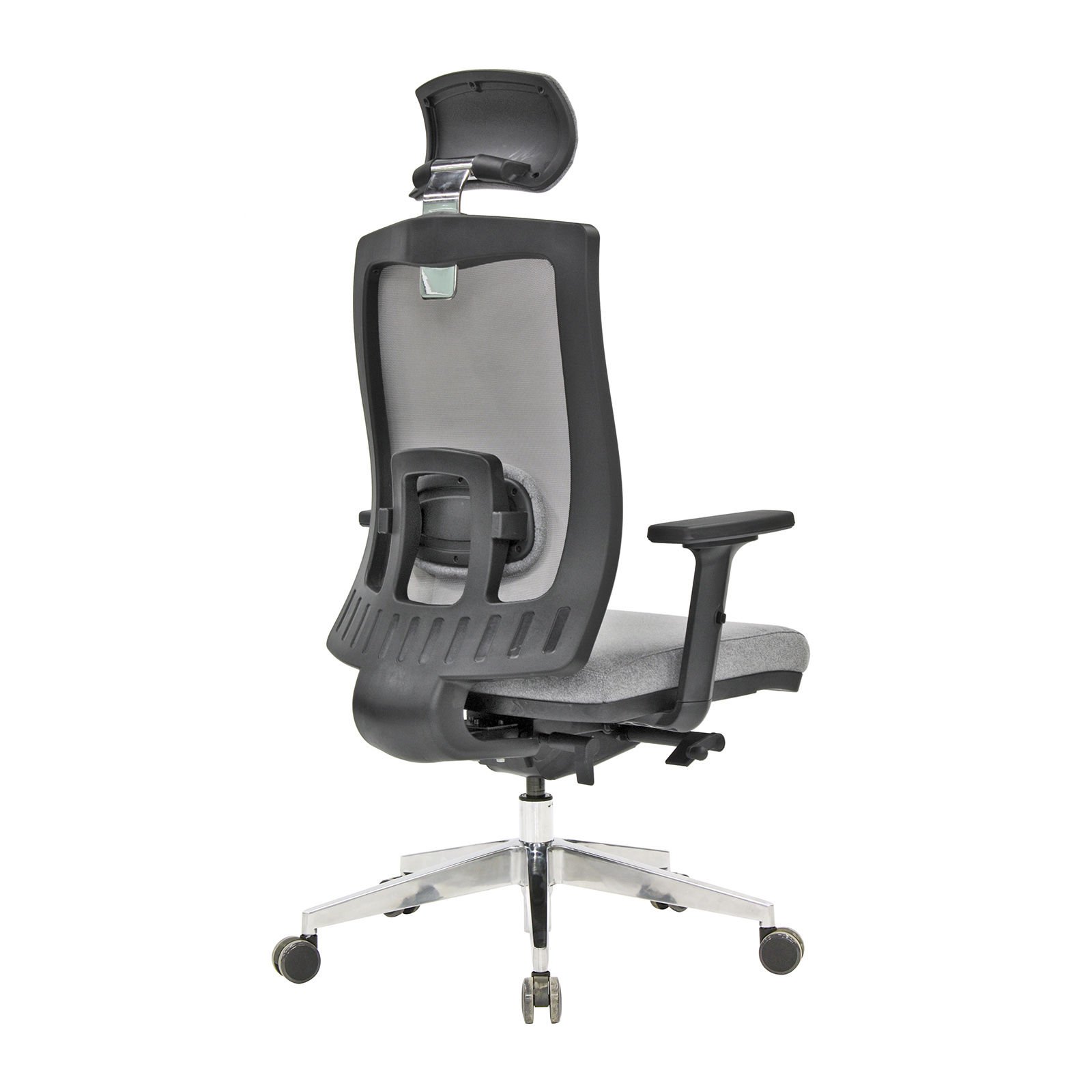 Upholstered back, black plastic body, plastic and aluminum legs, adjustable and fixed arms,