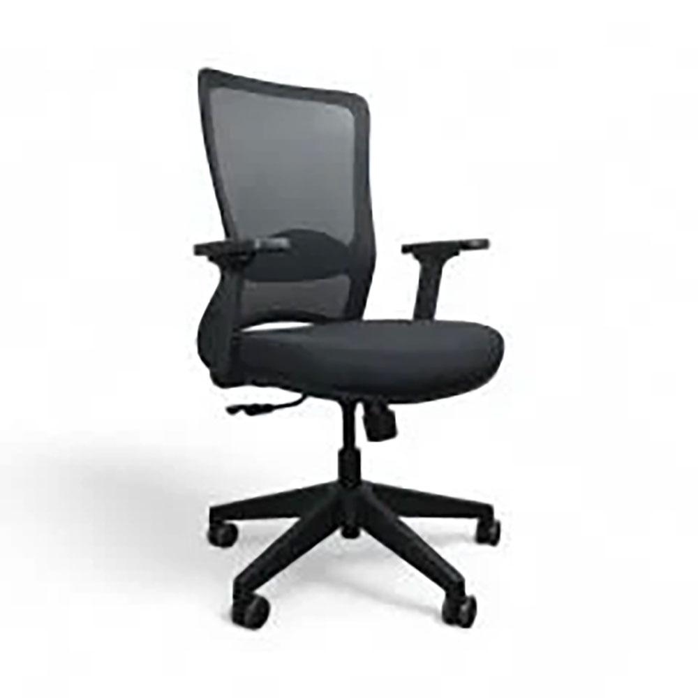 Black plastic frame / Adjustable arm / Plastic base / Multi-tilt mechanism / Lumbar support / Silicone wheels
