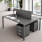 Designed to accommodate two users comfortably, the workstation features a central divider panel that provides visual separation without compromising openness. Its durable tabletop, sturdy metal legs, and mobile drawer units ensure long-term use and practical storage.