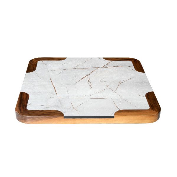 TAB 1823 kompaktna ploča za sto nudi profinjen i elegantan izgled zahvaljujući kombinaciji kompaktnog laminata sa mermernim efektom i masivnog okvira od orahovog drveta. Sa ukupnom debljinom od 40 mm, obezbeđuje visoku izdržljivost i stabilnost za intenzivnu komercijalnu upotrebu. Tople ivice od oraha dodatno naglašavaju sofisticirani karakter dizajna, čineći je idealnim izborom za kafiće, restorane, hotele i ekskluzivne ugostiteljske enterijere.