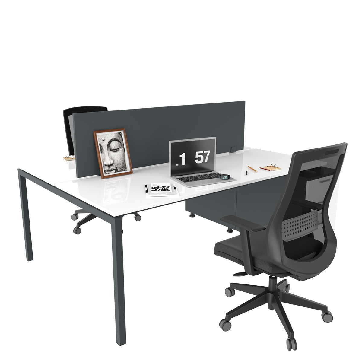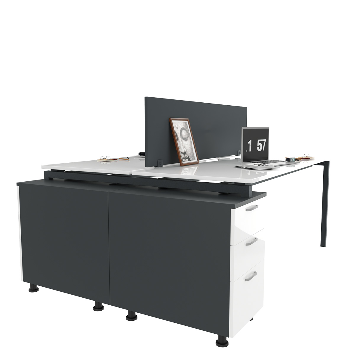 EAR Dupla Radna Stanica sa Podstolnim Fiokarom dizajnirana je za veću produktivnost i organizaciju u zajedničkim radnim prostorima. Njena konfiguracija za dve osobe omogućava efikasan rad, dok integrisani podstolni element pruža praktičan prostor za odlaganje dokumenata i kancelarijskog materijala.