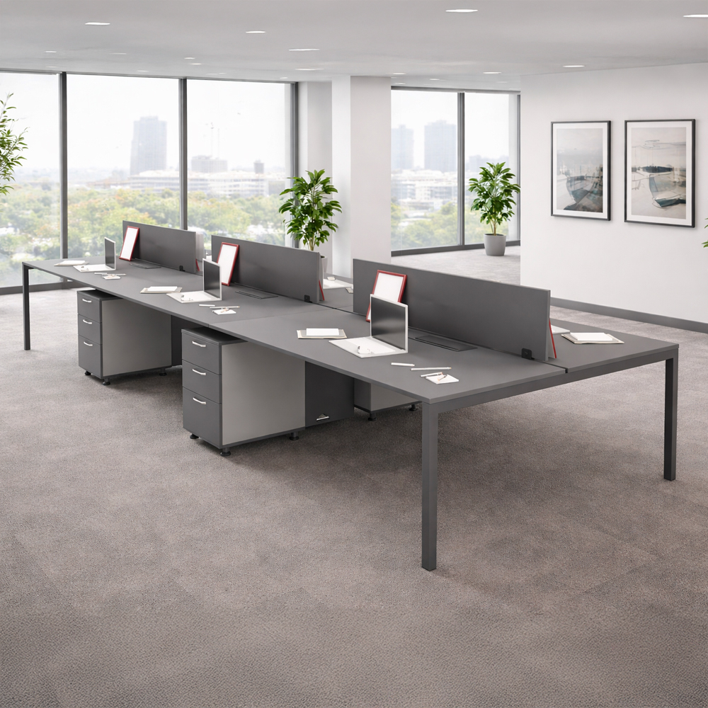 Designed to accommodate six users comfortably, STYLUS provides individual working areas with integrated privacy panels while maintaining visual harmony and team interaction. The spacious desktop allows for daily work essentials, monitors, and accessories without clutter.