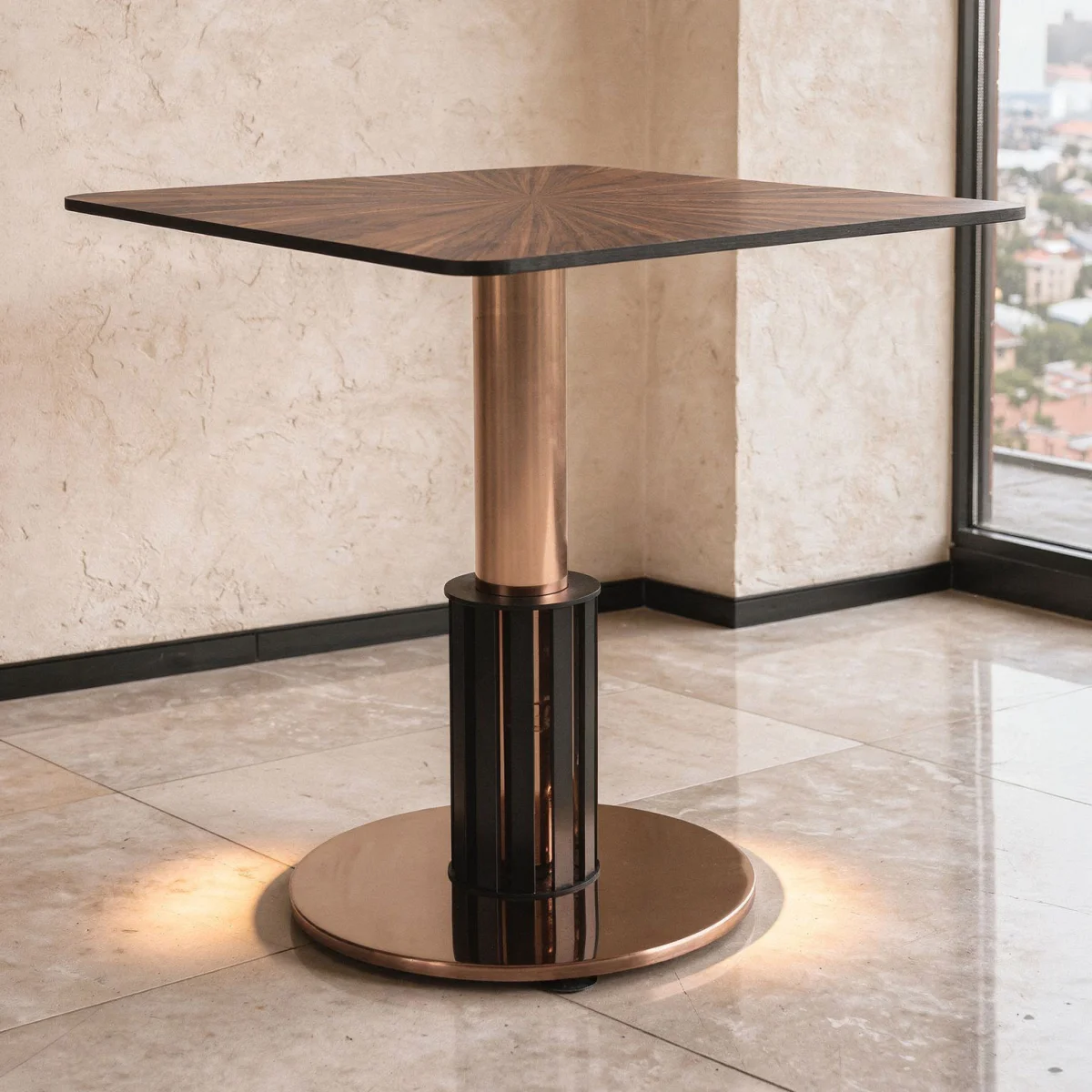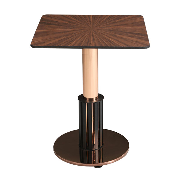 Čelična baza AY 1915 obezbeđuje izuzetnu stabilnost i dug vek trajanja, dok centralni stub sa dekorativnim metalnim detaljima doprinosi elegantnom i luksuznom izgledu. Sto je savršen izbor za kafiće, restorane, hotele i moderne ugostiteljske prostore.
