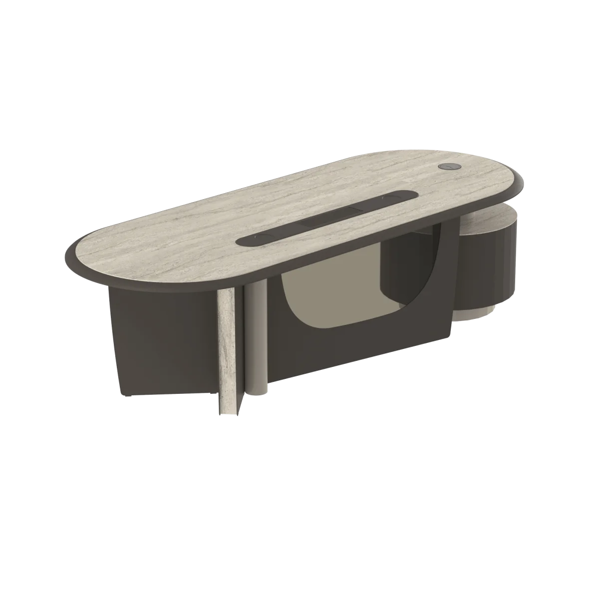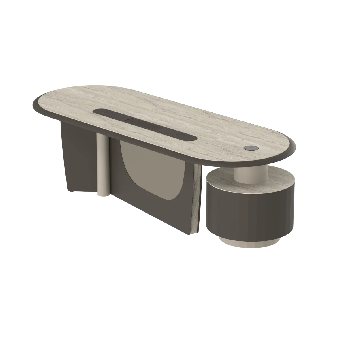 Monolith menadžerski set predstavlja snagu, ravnotežu i prestiž u savremenim kancelarijskim prostorima. Svojom skulpturalnom formom i monolitnim karakterom donosi snažan arhitektonski izraz, dok sklad svetlih i tamnih tonova stvara sofisticiranu i elegantnu atmosferu.